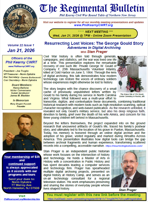 On January 21, 2026, I was honored to be invited to present “Resurrecting Lost Voices: The George W. Gould Story … Adventures in Digital Archiving” via zoom to the Phil Kearny Civil War Roundtable of Northern New Jersey.